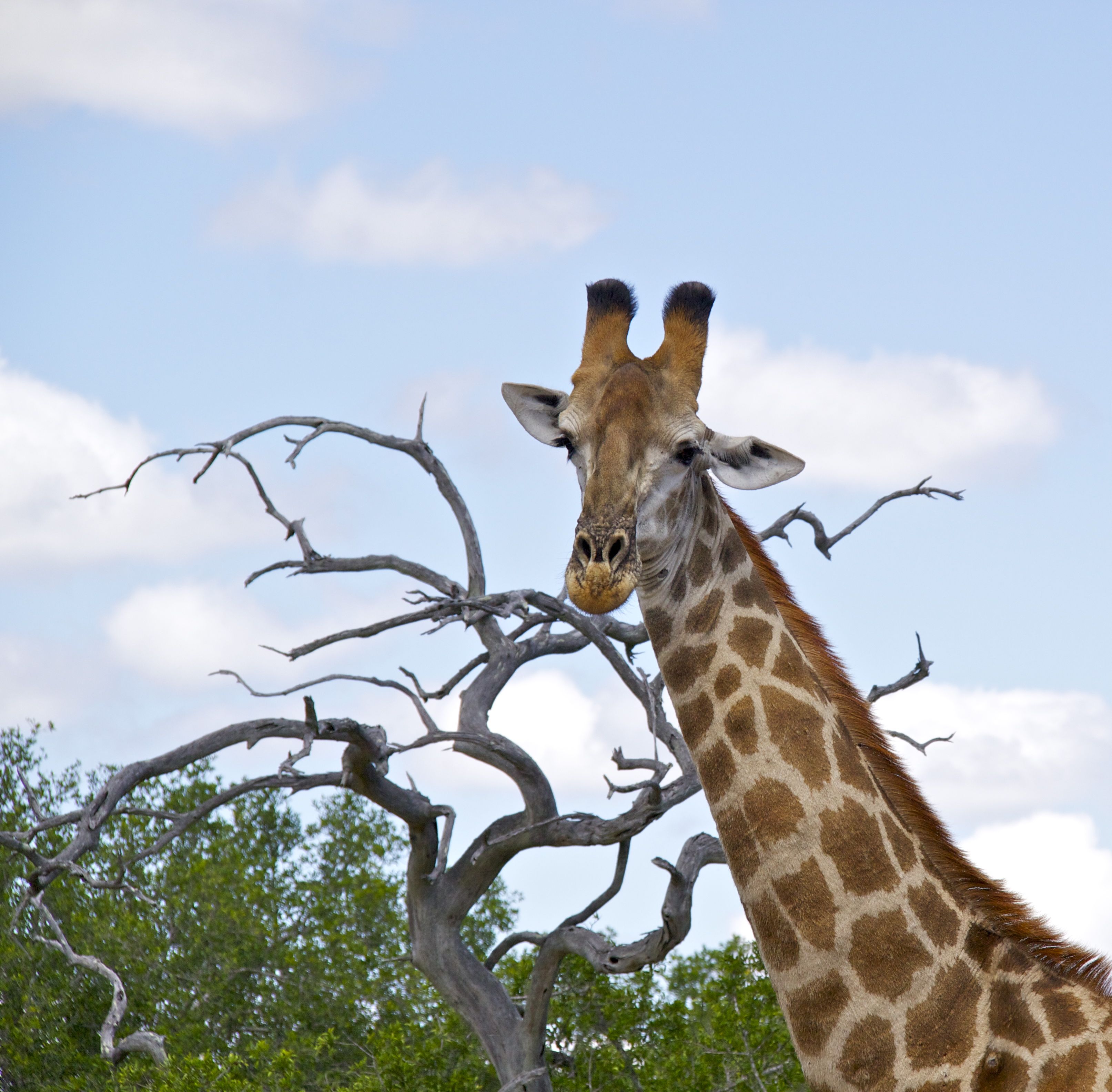 I was mesmerized by the giraffe, more than I could have expected. Perhaps it’s the way he looked against the backdrop of the bush, his body extending from the earth, through the lush green trees, and up into the open blue skies. The giraffe seemed peaceful and content. I watched the giraffe as I removed the long lens from my camera. I smiled at the discovery that we were too close to use a long lens. We watched the giraffe’s behavior for several minutes, laughing as he walked in circles around the tree, to relieve his itchy skin.